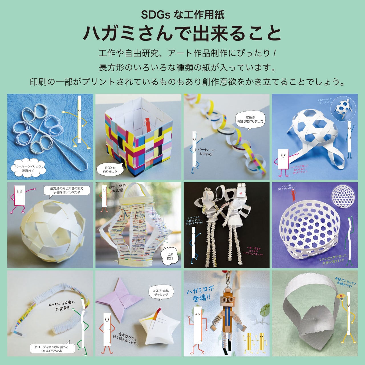 印刷制作時に出る裁断したはぎれ紙を集めてパッケージした工作用紙です。40㎝を超える細長い用紙も入っております。印刷用のトンボマークや、印刷をきれいに仕上げるために仕上りよりはみ出して印刷された部分が残っている。長方形の用紙はいろいろな事に使えます。